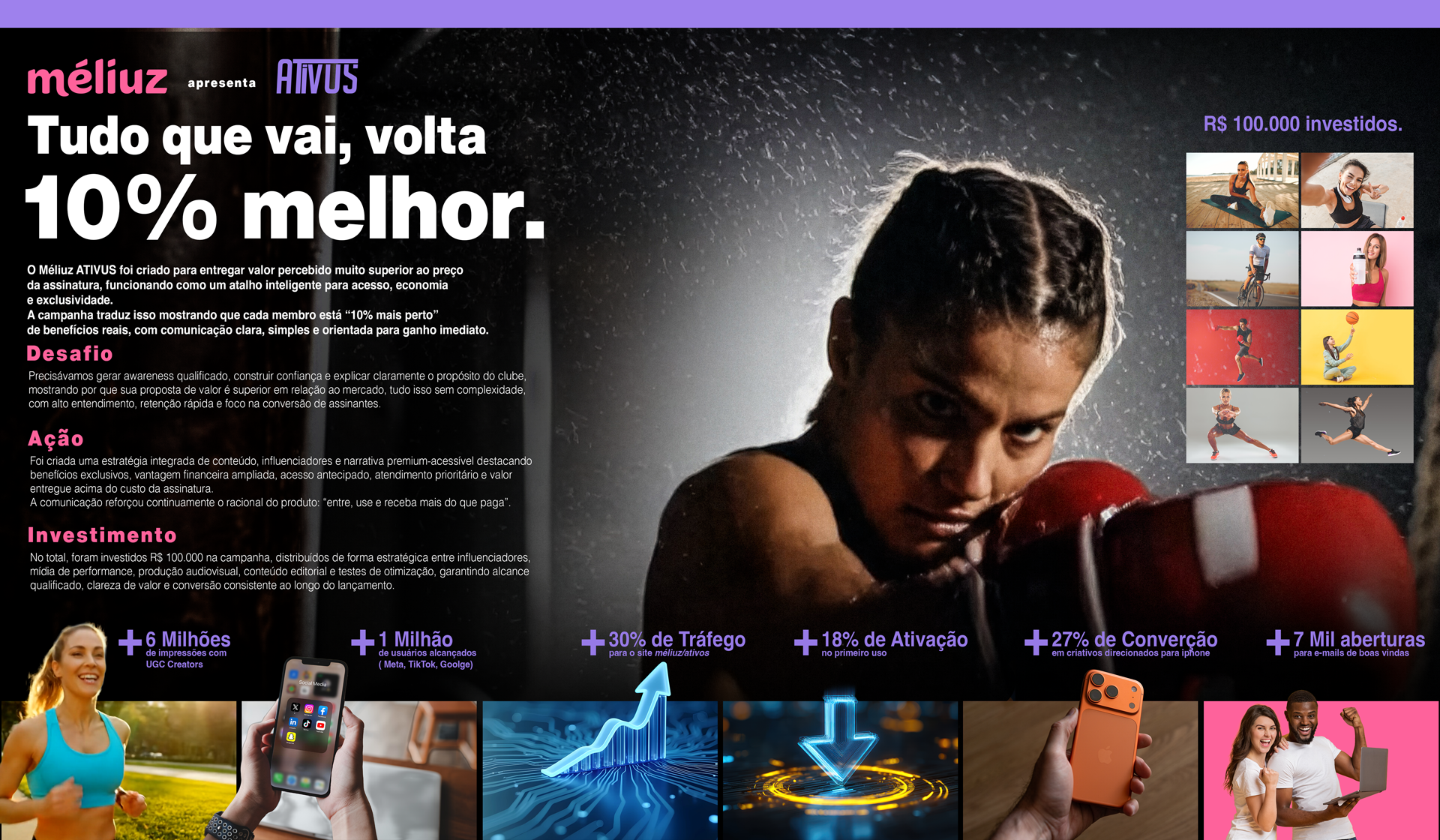 Cashback no território do esporte. Méliuz Ativus conecta a marca a um estilo de vida ativo e progressivo, usando o universo esportivo como símbolo de atitude, constância e performance cotidiana — sem depender de métricas físicas ou competição.